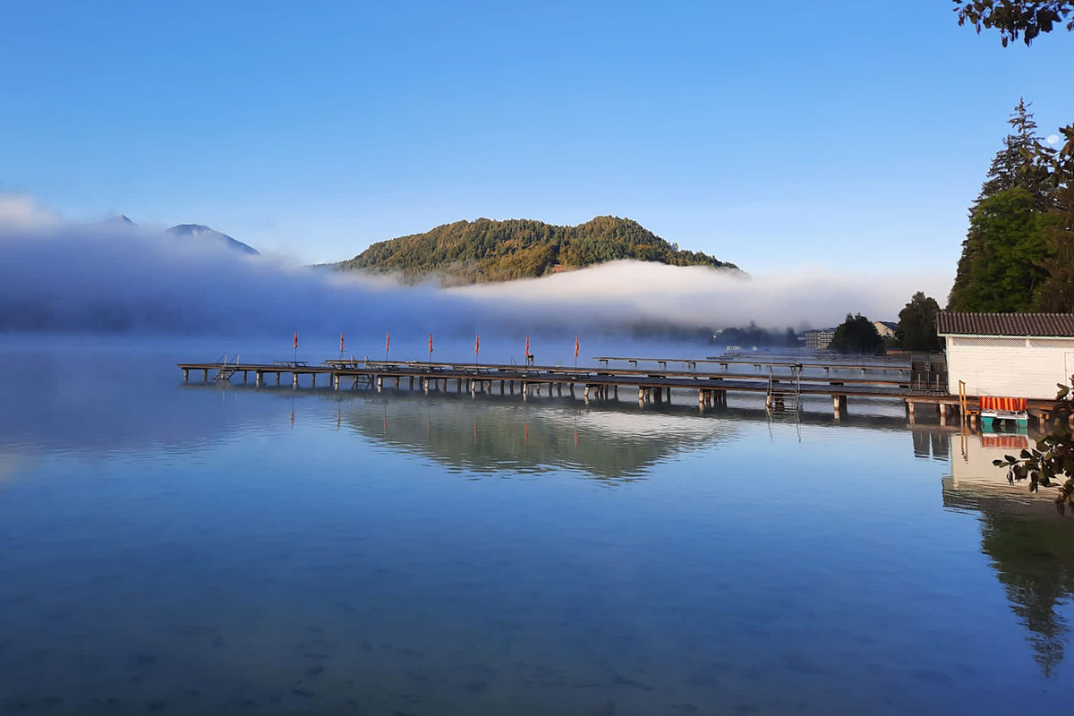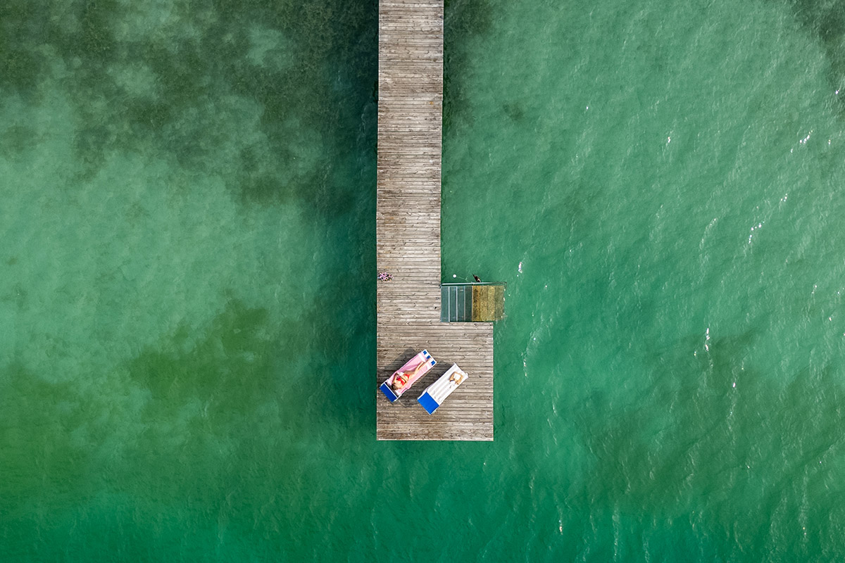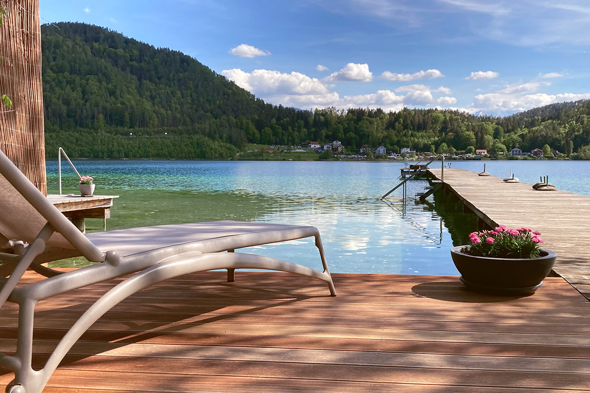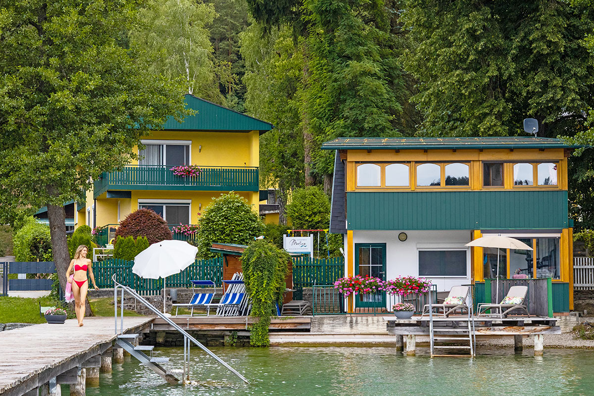 The private beach on the lakeside promenade is located directly opposite the residential complex and is exclusively available to our guests. The shore area of our beach is shallow and gently sloping. The end of the bathing jetty is well suited for children to jump. Umbrellas and sunbeds are sufficiently available.
